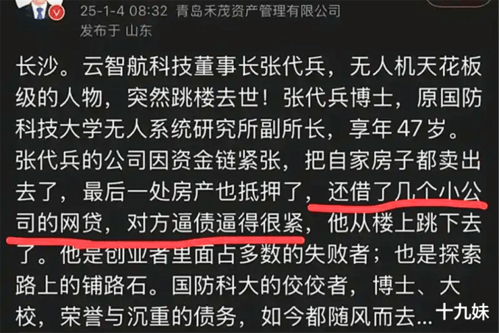 还有的,已经为此付出了惨痛代价,甚至付出了生命。今年年初,无人机领域顶级专家,47岁的张代兵博士跳楼身亡,当时有报道说他遭受过暴力催收和羞辱。可见,这已经是一个很严重的社会问题了!